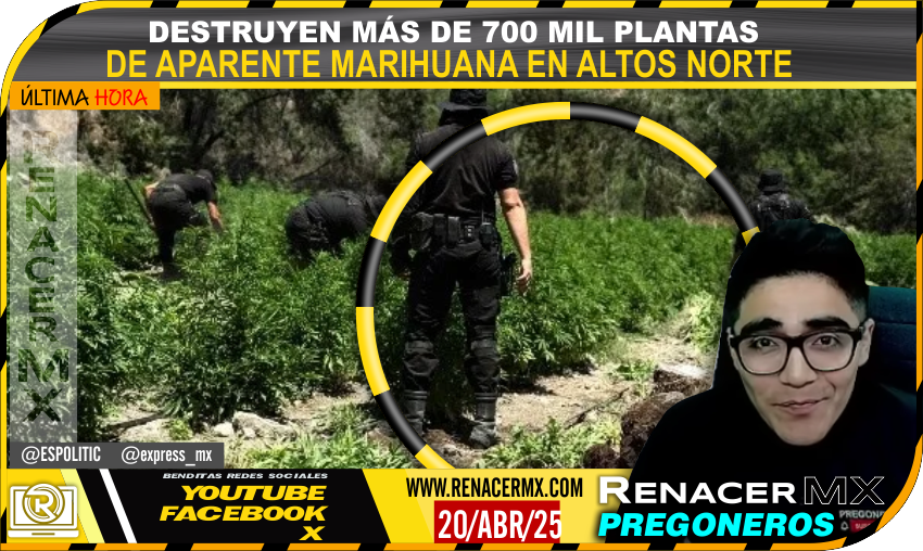 En un operativo realizado por la Secretaría de Seguridad del Estado, a través de la Policía Regional, fueron localizadas y aseguradas 10 hectáreas con seis plantíos de aparente marihuana en la Región Altos Norte, donde se destruyeron alrededor de 700 mil plantas.