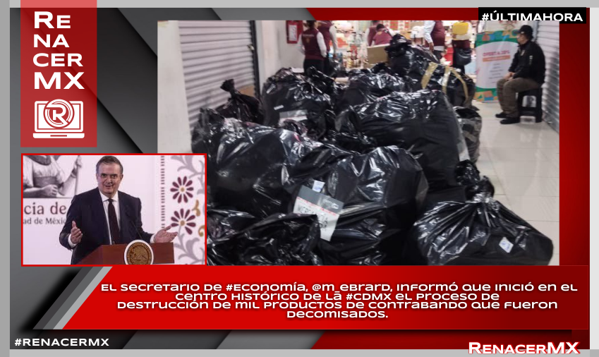 El Secretario de #Economía, @m_ebrard, informó que inició en el Centro Histórico de la #CDMX el proceso de destrucción de mil productos de contrabando que fueron decomisados.