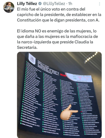 Lilly Téllez fue la única senadora que se opuso a modificar la Constitución para incluir la forma femenina “PresidentA”.