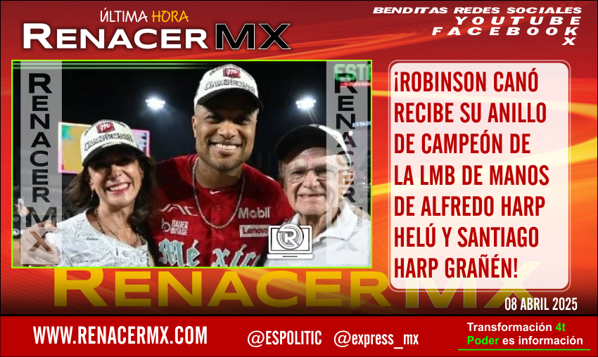 El estelar segunda base dominicano, Robinson Canó, fue honrado con el anillo de campeón de la Liga Mexicana de Béisbol (LMB) en una ceremonia especial. La presea le fue entregada por el presidente del Consejo de Administración de los Diablos Rojos del México, Alfredo Harp Helú, y su vicepresidente, Santiago Harp Grañén.