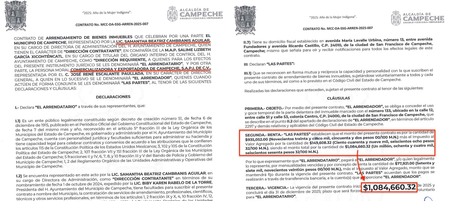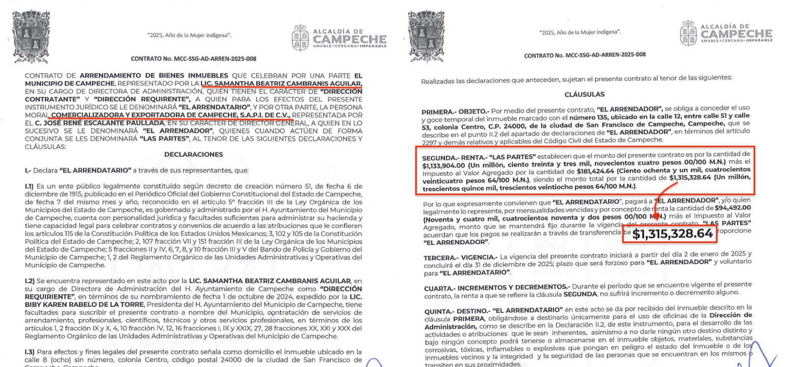 Como directora de Administración del Ayuntamiento de Campeche, Samantha Beatriz Cambranis Aguilar, el pasado mes de enero de este 2025,la empresa Comercializadora y Exportadora de Campeche firmó dos contratos sin licitación para el arrendamiento de dos inmuebles.
