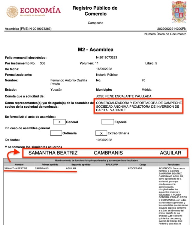 La fecha clave es el 16 de septiembre de 2022, cuando a solicitud de José René Escalante Paullada, se nombra a Samantha Beatriz Cambranis Aguilar como apoderada de la sociedad, para que coadyuven en la administración, otorgándole facultades como poder general para pleitos y cobranzas a nombre de la citada empresa: Comercializadora y Exportadora de Campeche SAPI de CV.