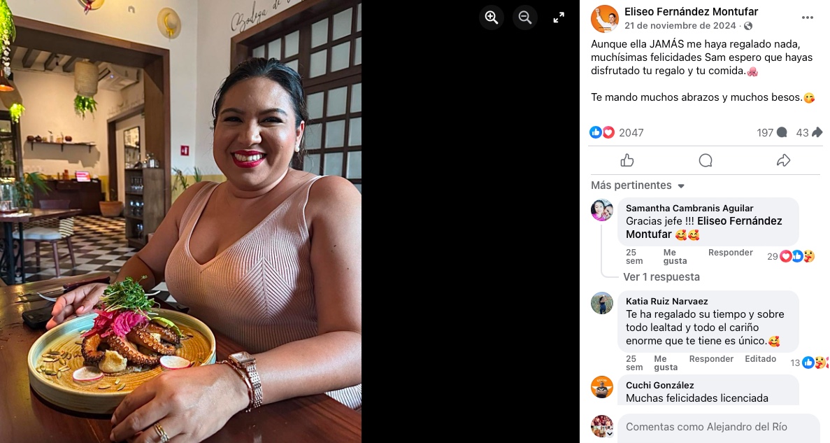 “En diversas publicaciones de la red Facebook, Eliseo hace alusión a la actual directora de Administración del municipio de Campeche, a la que llama Sam, mientras que Samantha Beatriz se refiere a Eliseo como “Jefe”, pues ella ocupó la cartera de Subdirectora de la Oficina de la Presidencia Municipal en la administración de Fernández Montufar.