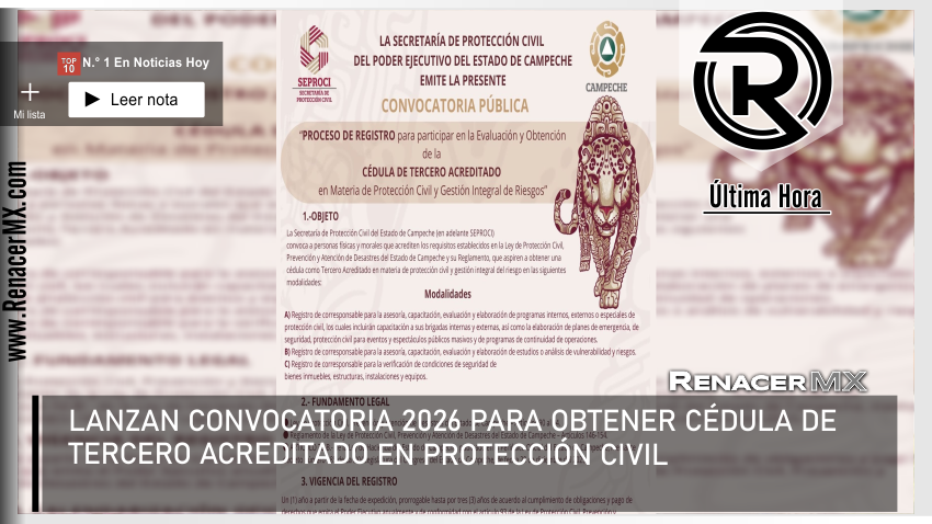 La Secretaría de Protección Civil del Poder Ejecutivo del Estado de Campeche (SEPROCI) anunció la apertura de la Convocatoria Pública 2026 para participar en el proceso de registro, evaluación y obtención de la Cédula de Tercero Acreditado en materia de Protección Civil y Gestión Integral de Riesgos.