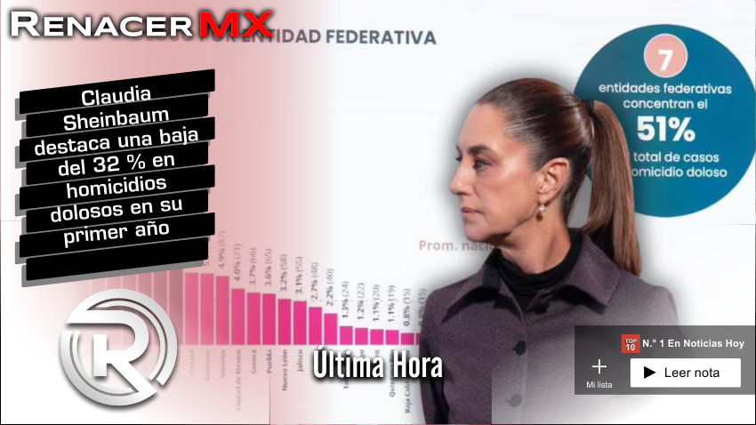 La presidenta Claudia Sheinbaum puso énfasis en que, entre septiembre de 2024 y septiembre de 2025, el país registró una reducción del 32 % en homicidios dolosos. Esto equivale a 27 muertes menos al día por ese delito.